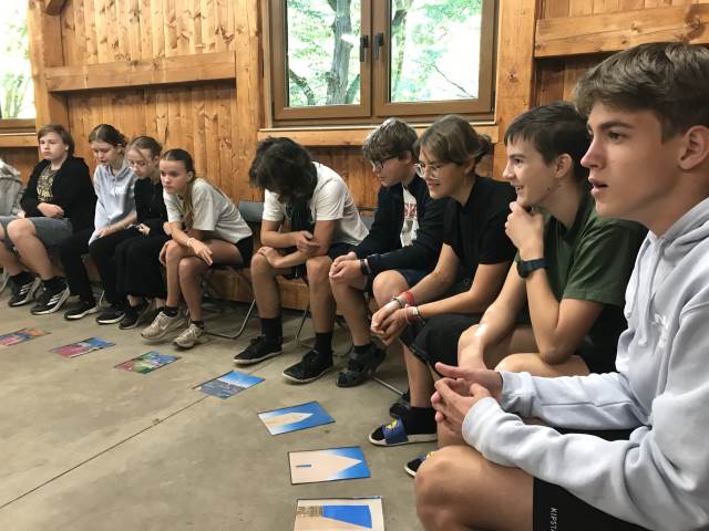 Čtvrteční dopoledne bylo takové sportovní. Rozdělili jsme se na týmy po deseti a plnili kolečka úkolů – klávesnice (abeceda tam i zpátky i s během!), nošení míčku v kroužku na špagátku s prolézáním překážek, otočení ubrusu zatěžkaného deseti páry nohou bez přešlapu… Všechny úkoly byly o spolupráci, rozdělení rolí v týmu, vzájemné podpoře, komunikaci, ale nechyběly ani dotyky tělo na tělo. Všichni jsme to zvládli, byla legrace i zdravé soutěžení. Jakmile jsme splnili úkoly, čekal nás oběd. Po tom, co jsme rozmazlení z naší školní jídelny, jsem měla trochu obavu, abychom nedostali UHO, knedlík a nějakou podešev. Ovšem krásný den pokračoval i přes oběd. Polévku jsme si nabrali sami, podle chuti. Hlavní chod naservíroval pan kuchař. Mohli jsme si dát navíc i těstovinový salát, zeleninu z volně dostupného zeleninového baru, k pití čaj nebo vodu. Paráda. Nikdo neodcházel hladový. Následovalo ubytování v pokojíčcích a odpolední program.