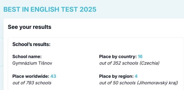 V mezinárodní soutěži Best in English, která proběhla online koncem listopadu, se Gymnázium Tišnov umístilo na krásném 4.místě v rámci Jihomoravského kraje, 16. v České republice a celkově na 43.místě ze všech zemí, které se soutěže zúčastnily.