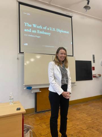 Dnes jsme ve škole přivítali zástupkyni kulturního atašé Americké ambasády paní Monicu Davis, která přijela na besedu s našimi studenty.